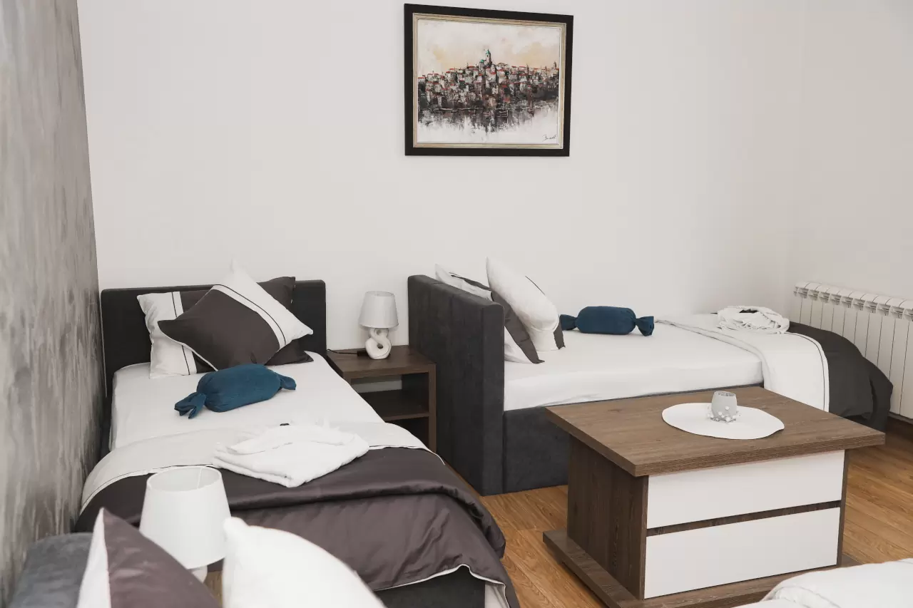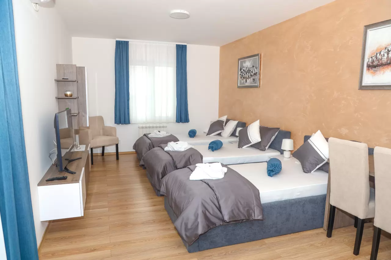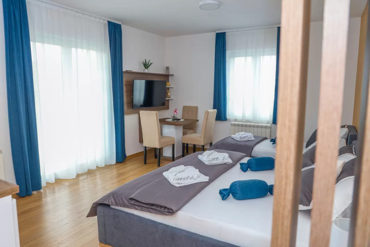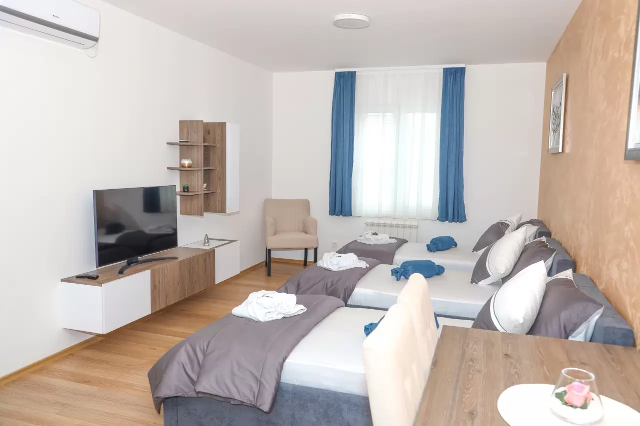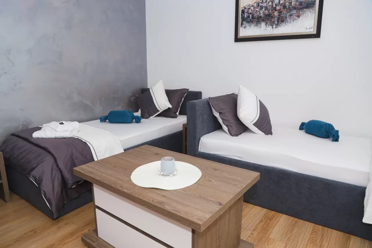 Apartmani mogu primiti od 3 do 5 osoba, što ih čini idealnim za parove, porodice ili manje grupe prijatelja. Svi naši apartmani su klimatizovani i dizajnirani tako da pruže maksimalnu udobnost i prijatnu atmosferu.