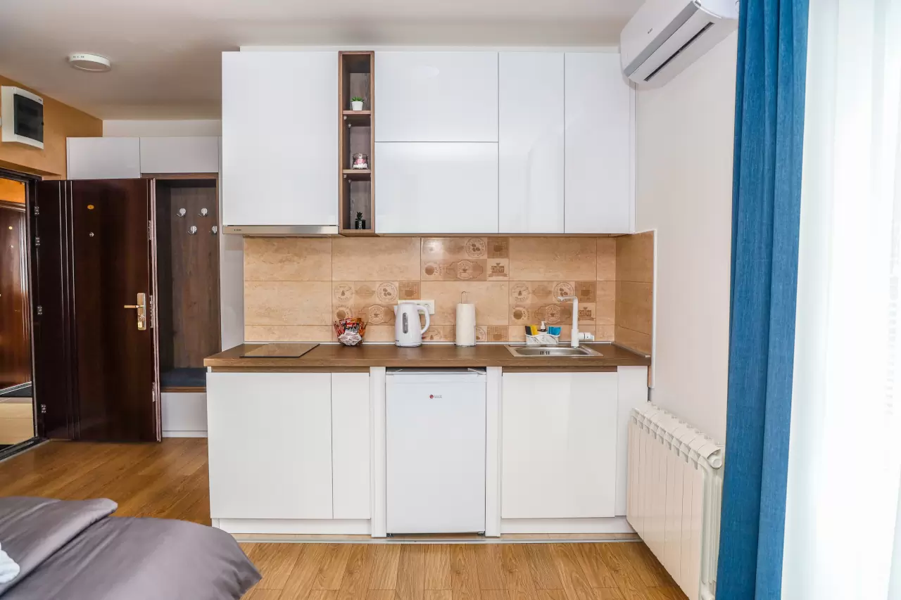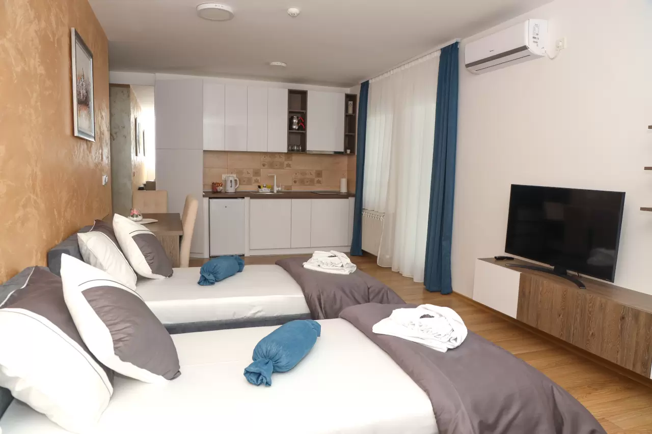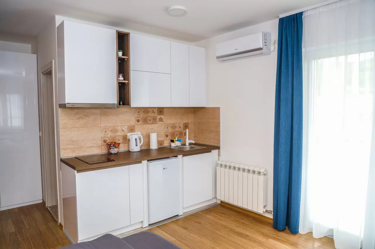 Svaki apartman ima potpuno opremljenu malu kuhinju, idealnu za pripremu obroka tokom vašeg boravka. Moderno opremljena kupatila pružaju sve što vam je potrebno za opuštanje i osveženje.