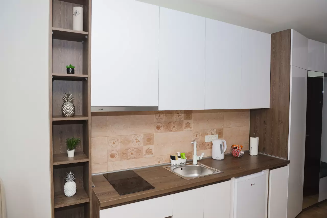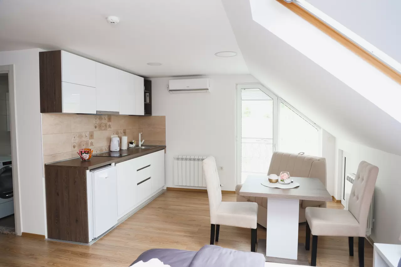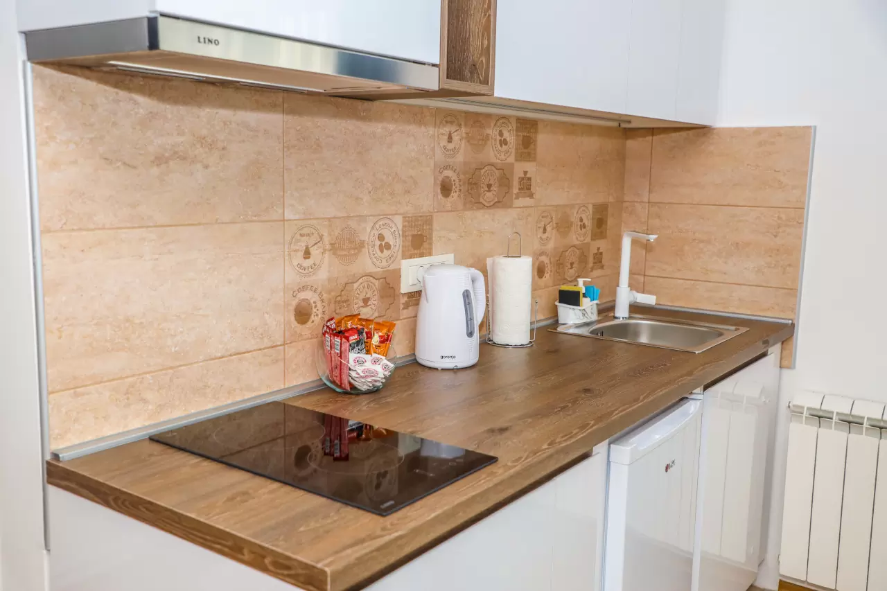 Svaki apartman ima potpuno opremljenu malu kuhinju, idealnu za pripremu obroka tokom vašeg boravka. Moderno opremljena kupatila pružaju sve što vam je potrebno za opuštanje i osveženje.