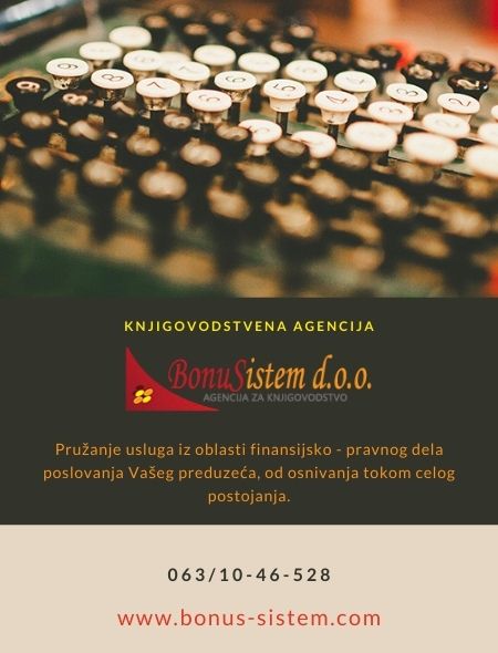 Bonus Sistem d.o.o. je knjigovodstvena agencija koja se bavi profesionalnim pružanjem usluga iz oblasti finansijsko – pravnog dela poslovanja Vašeg preduzeća, od osnivanja tokom celog postojanja.