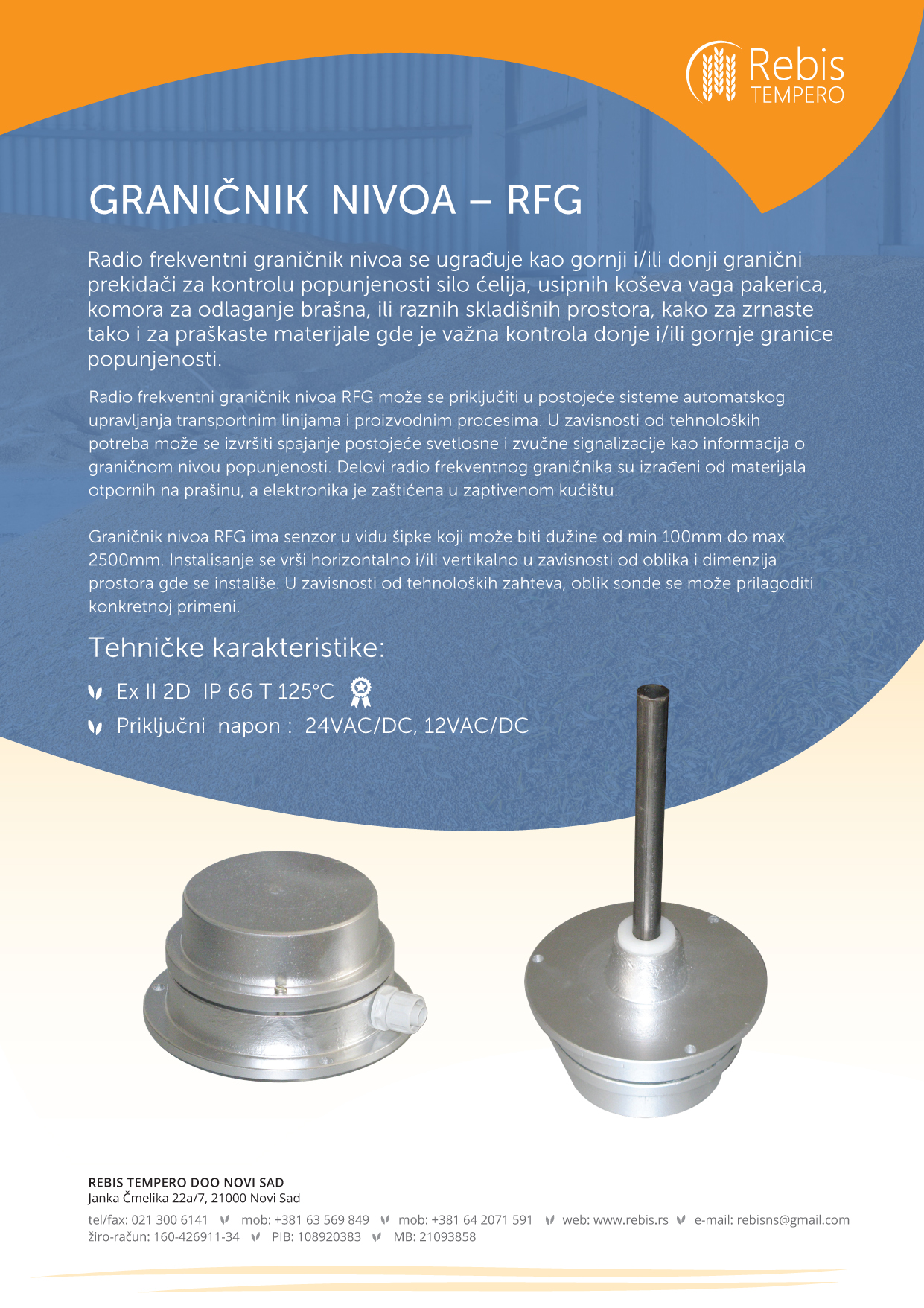 - radio frekventne graničnike nivoa pogodna za ugradnju u silo ćelije, ćelije za brašno, usipne koševe vaga ( protočnih i pakerica). Naš graničnik nivoa RFG-1 poseduje sertifikat EX i IP66 zaštitu.